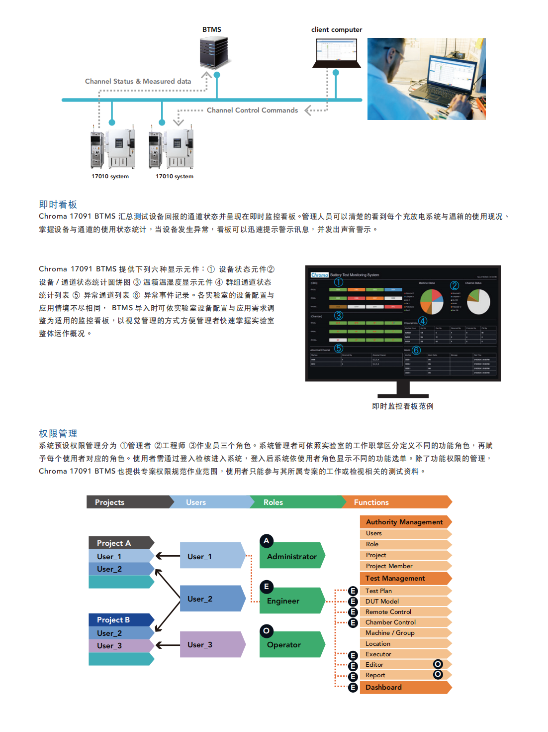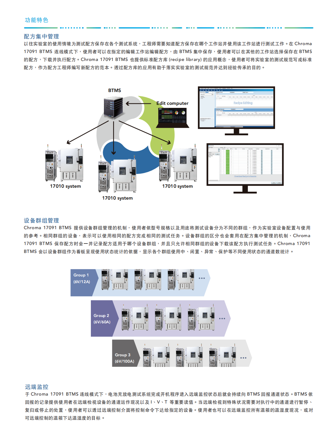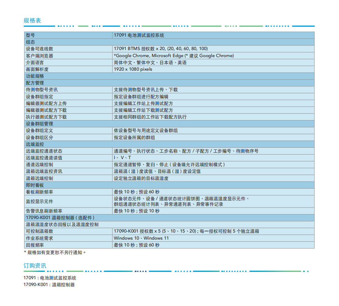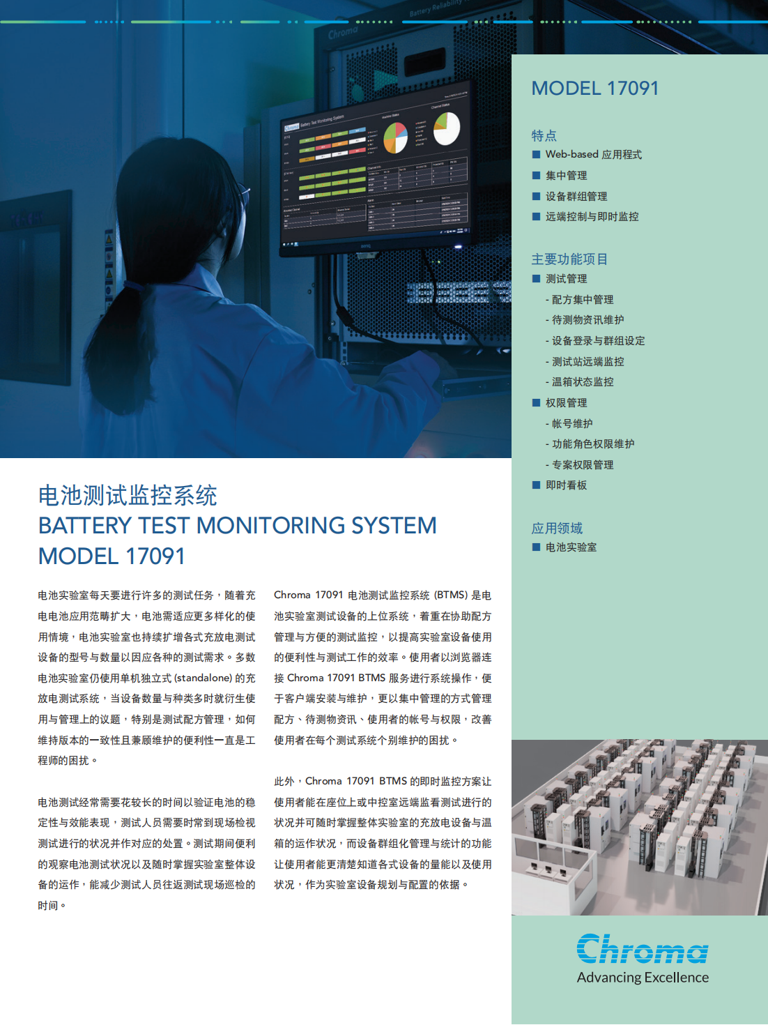 Chroma 17091电池测试监控系统(BTMS)是电池实验室测试设备的上位系统,着重在协助配方管理与方便的测试监控,以提高实验室设备使用的便利性与测试工作的效率。